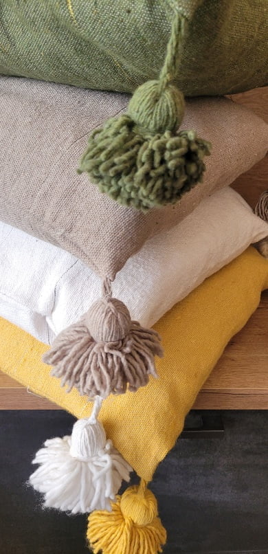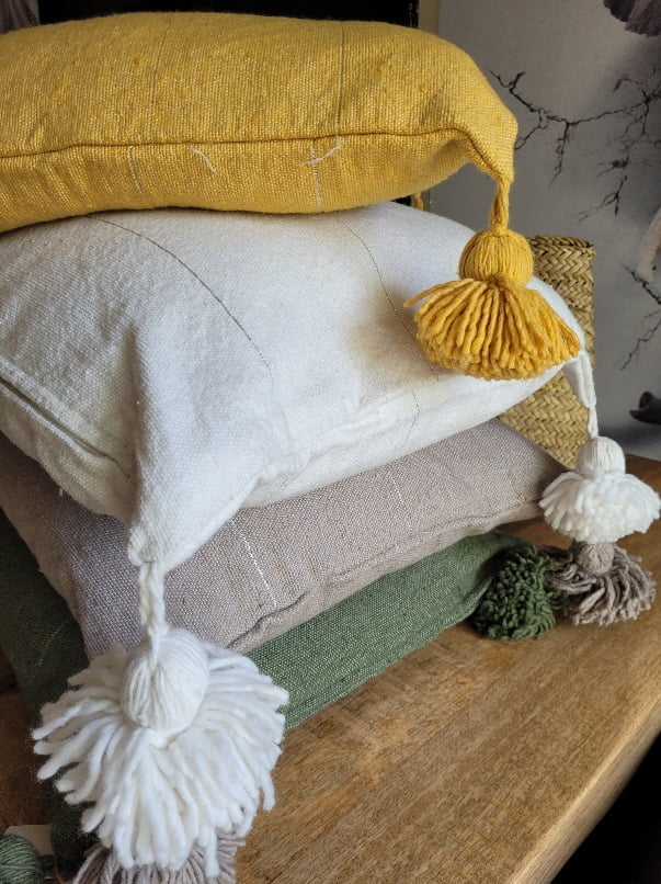 Ce coussin à pompons, confectionné en laine et coton, se distingue par sa forme carrée de 50 x 50 cm et ses gros pompons ornant chaque extrémité du coussin. Réalisé à la main par des artisans marocains talentueux, ce coussin incarne l'originalité et la chaleur de l'artisanat traditionnel. Ses pompons ajoutent une touche solaire et authentique à votre intérieur.