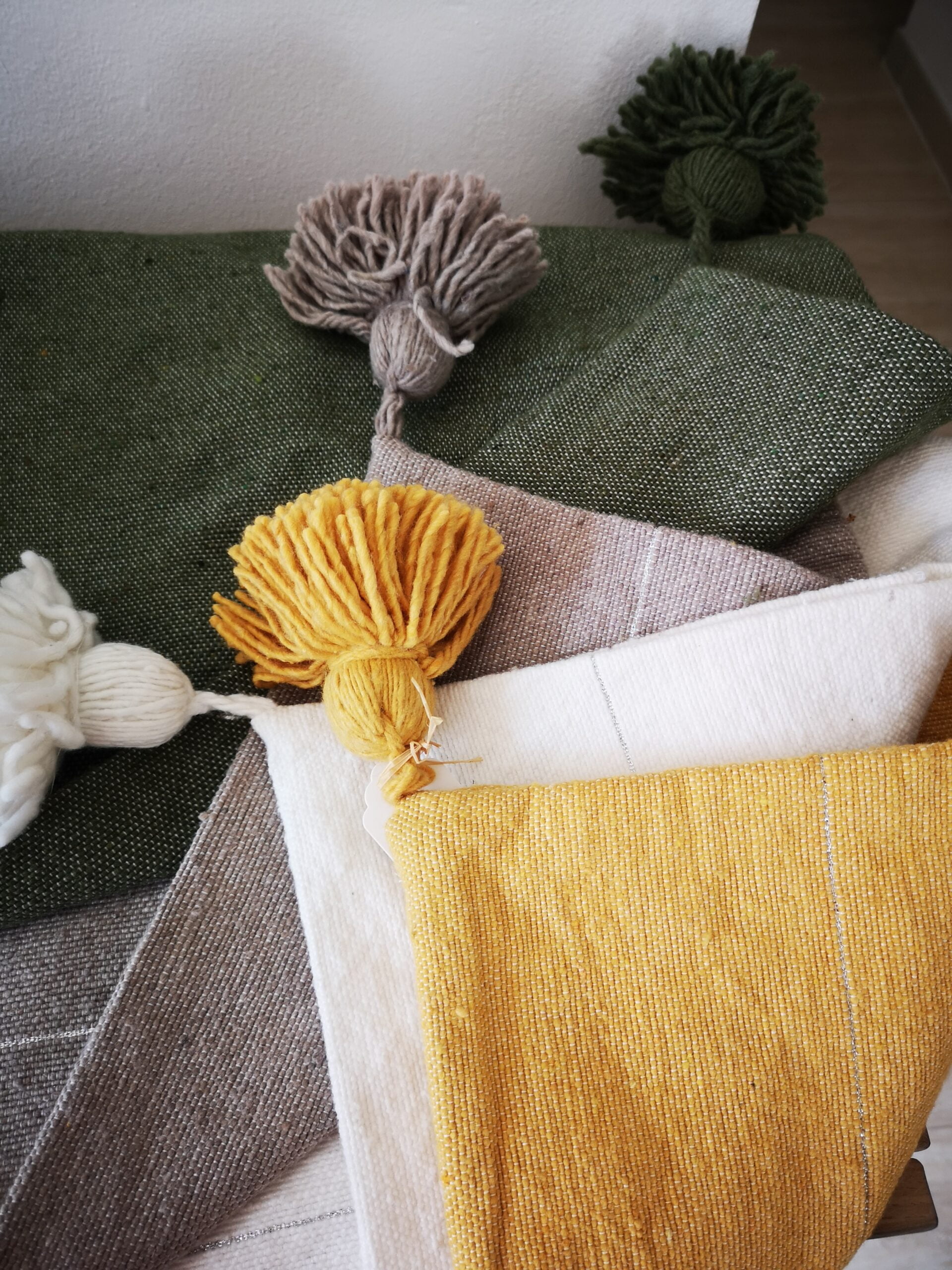 Ce coussin à pompons, confectionné en laine et coton, se distingue par sa forme carrée de 50 x 50 cm et ses gros pompons ornant chaque extrémité du coussin. Réalisé à la main par des artisans marocains talentueux, ce coussin incarne l’originalité et la chaleur de l’artisanat traditionnel, ajoutant une touche solaire et authentique à votre intérieur.